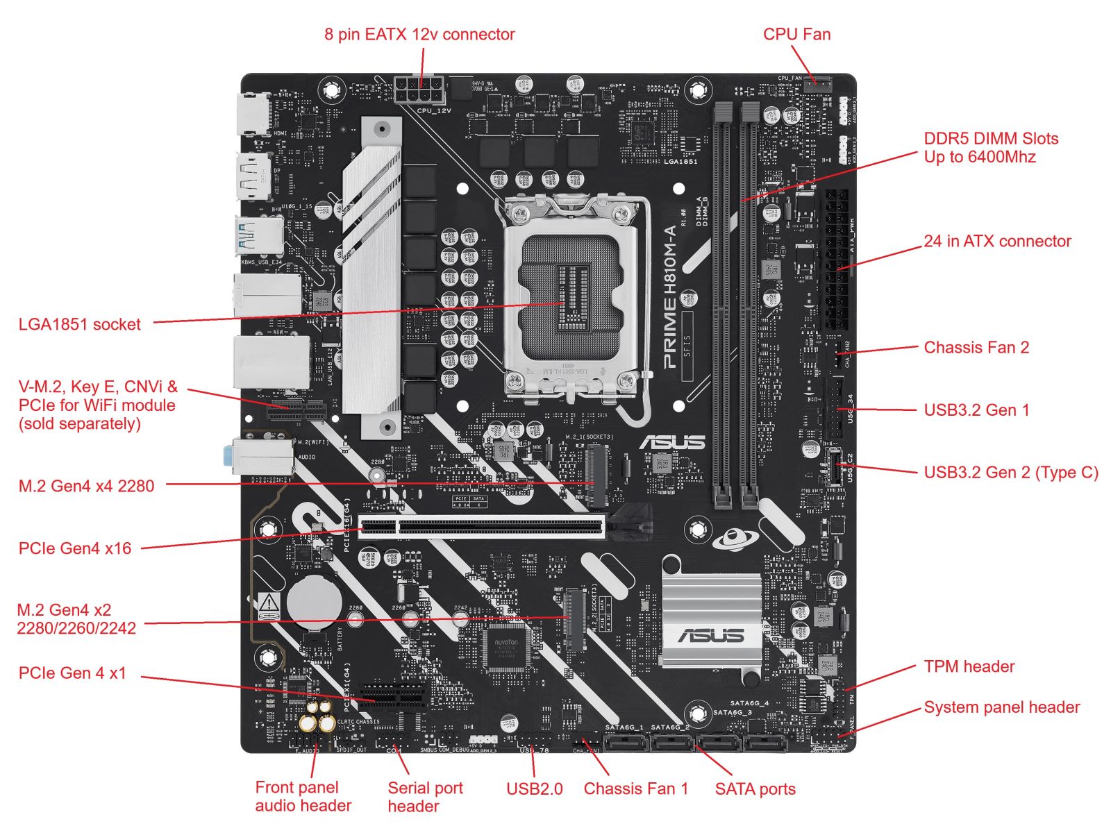 - One Vertical M.2 slot, Key E, CNVi/PCIe. Supporting Asus WiFi module and antenna kit (sold separately).